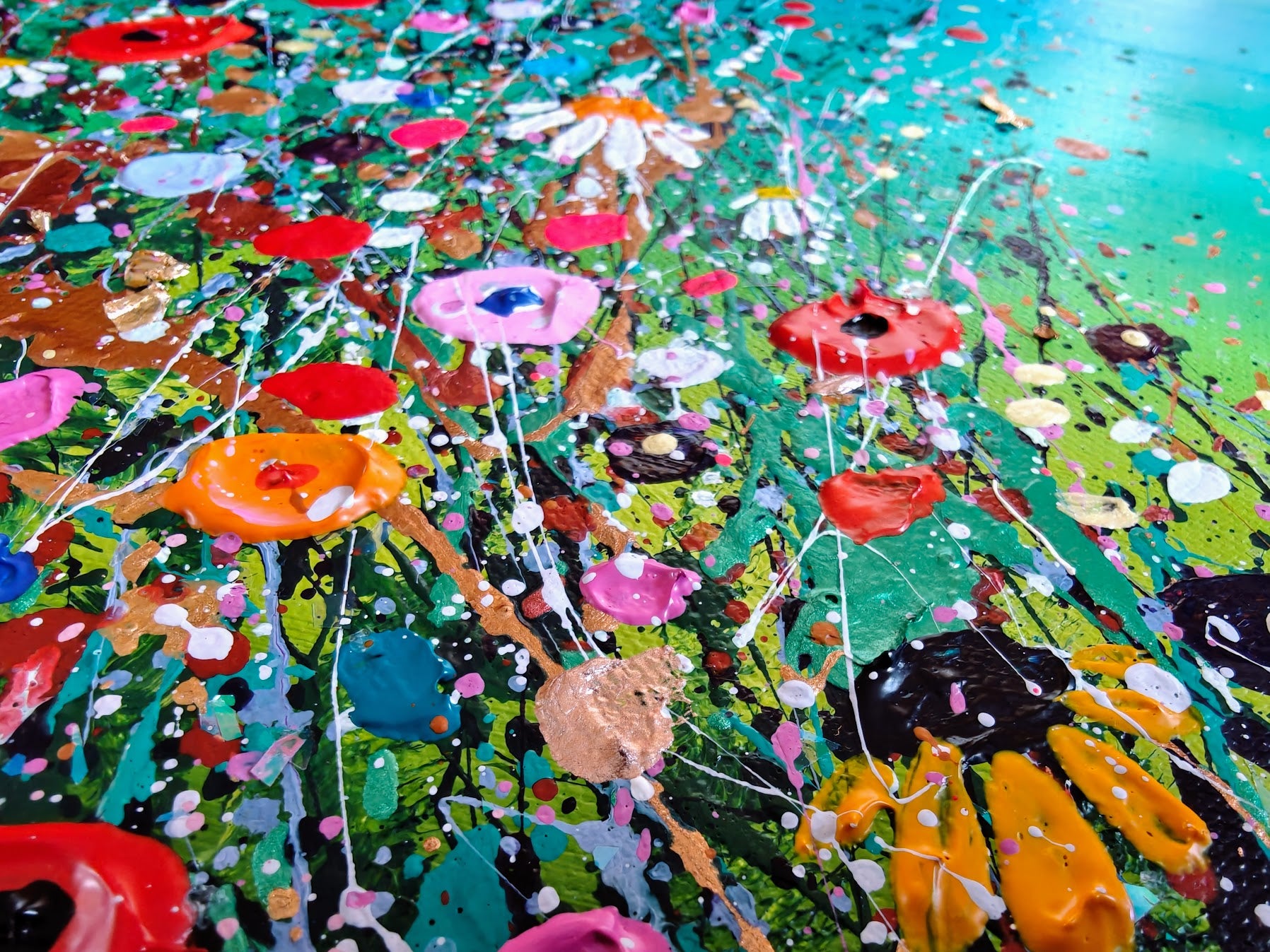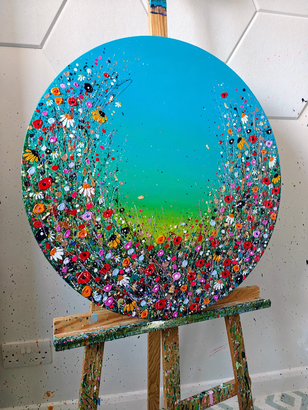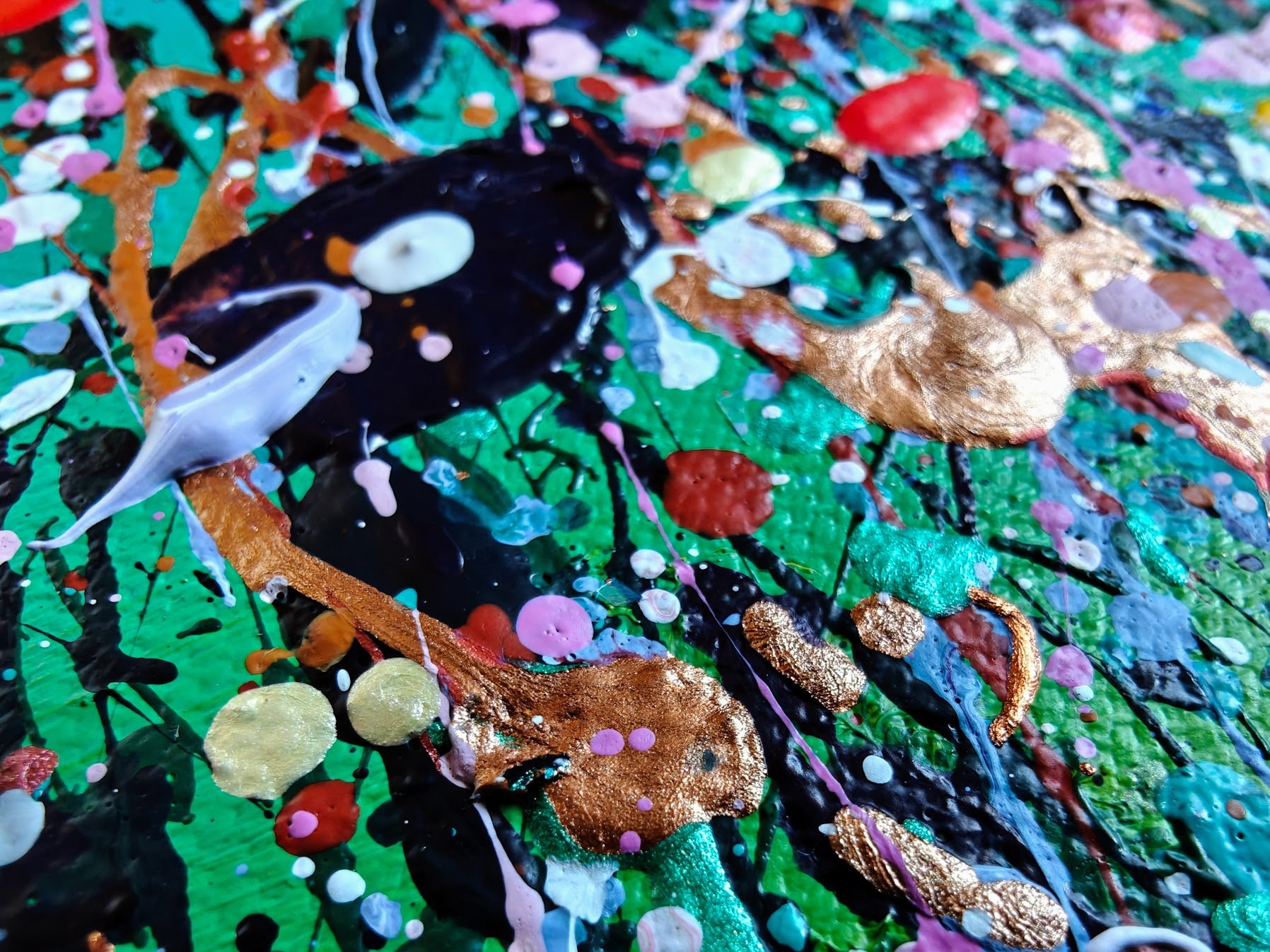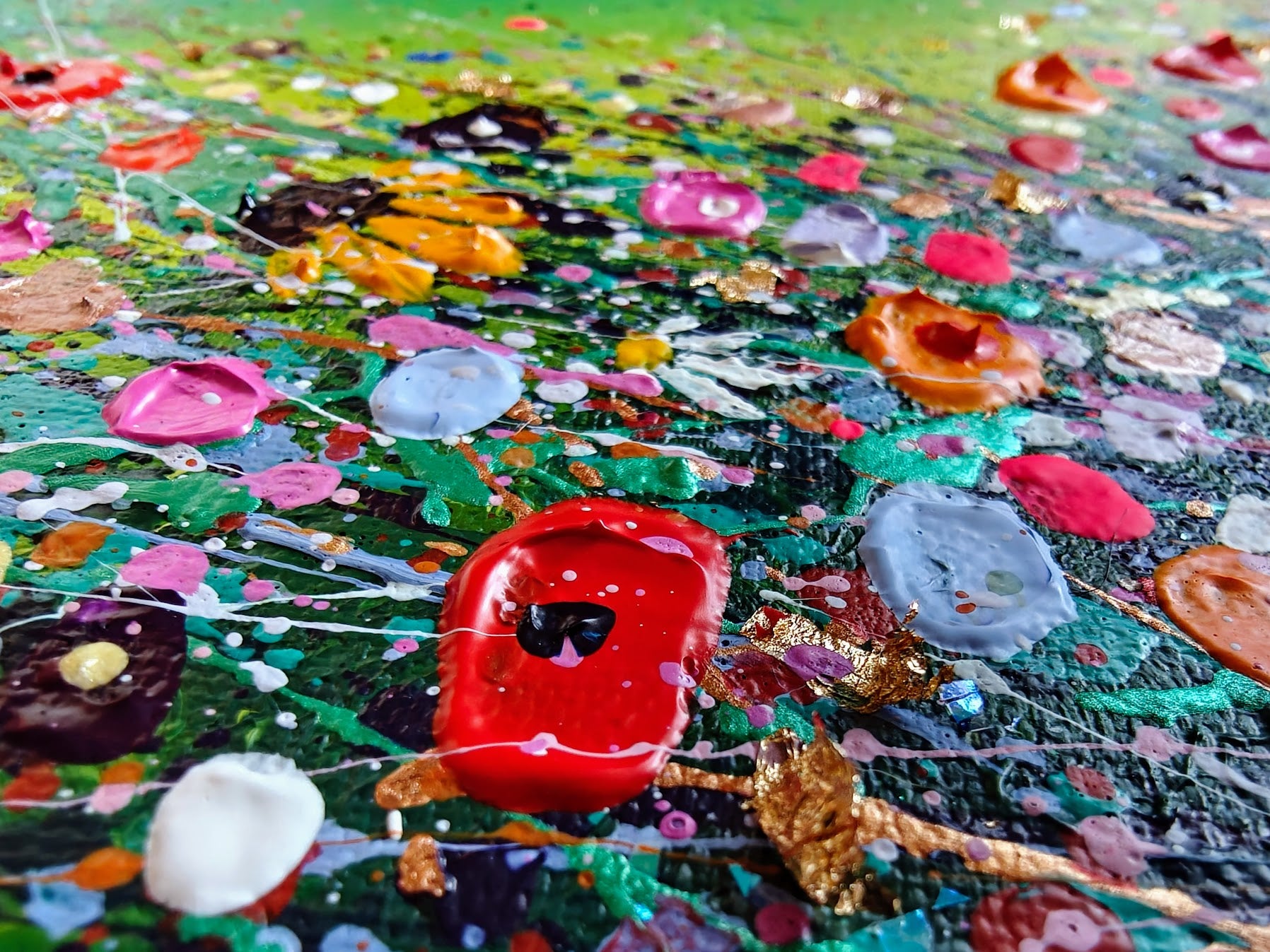 Acrylic, gold leaf, embellishments, and shimmer on stretched canvas.