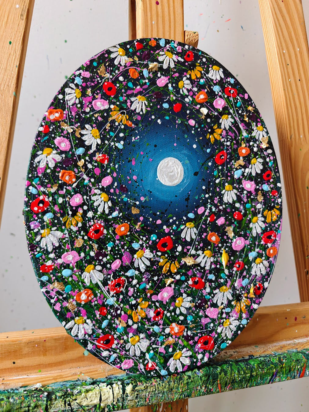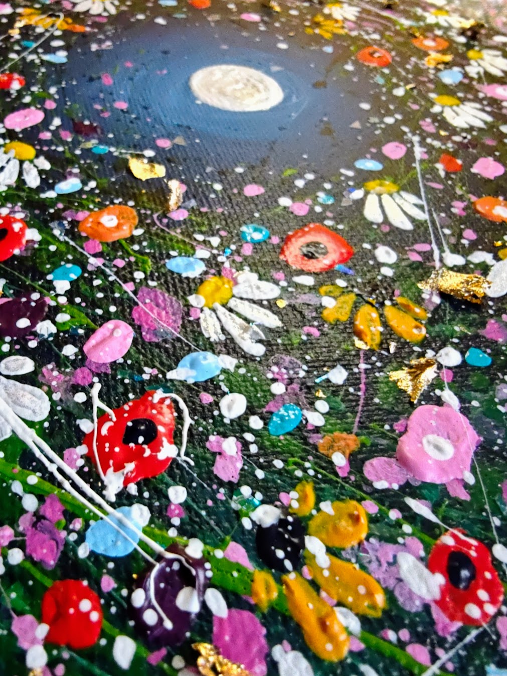 Acrylic, glitter, gold leaf, and embellishments on stretched canvas.