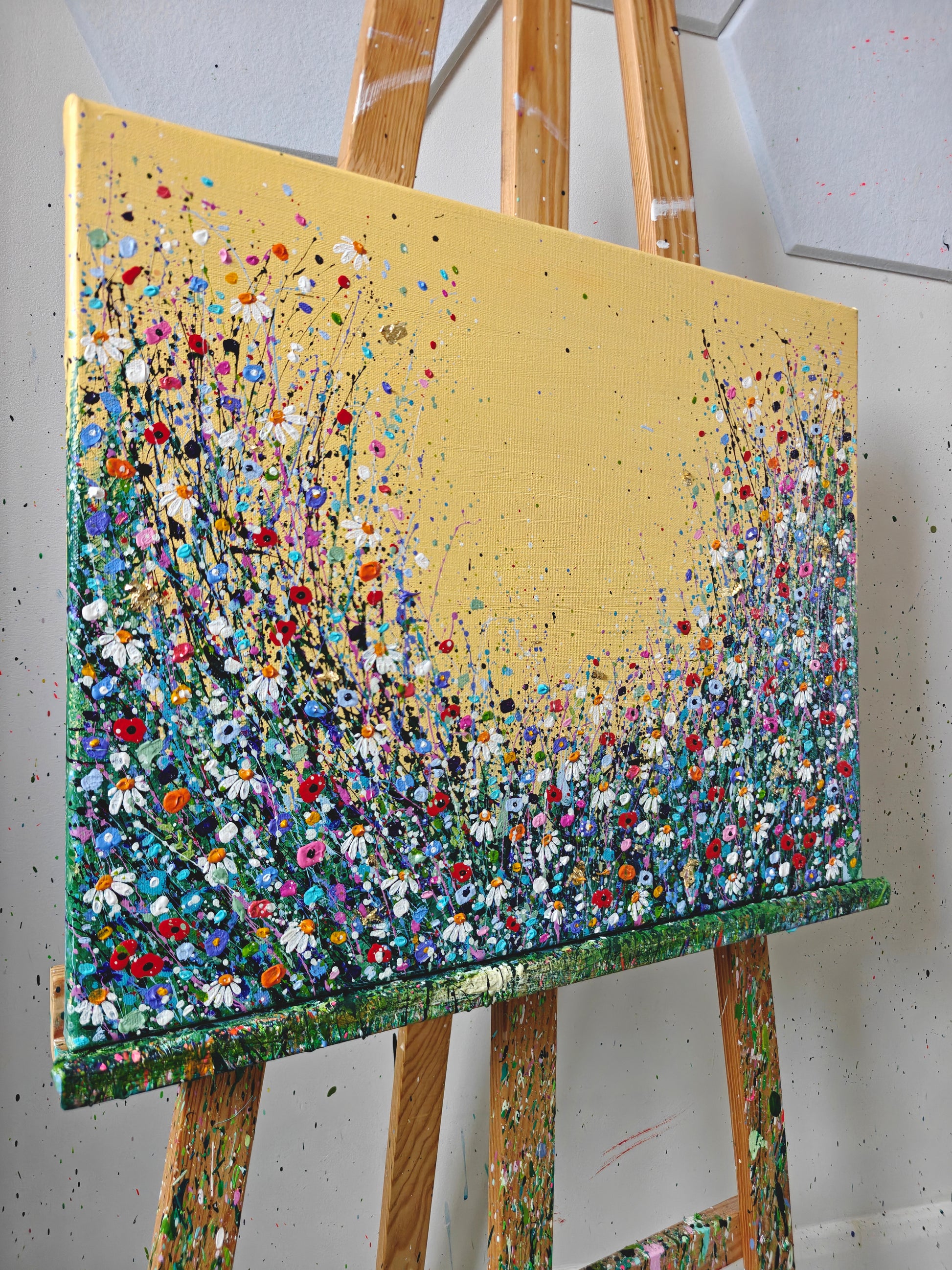 Acrylic, glitter, gold leaf and hand placed embellishments on stretched canvas.
