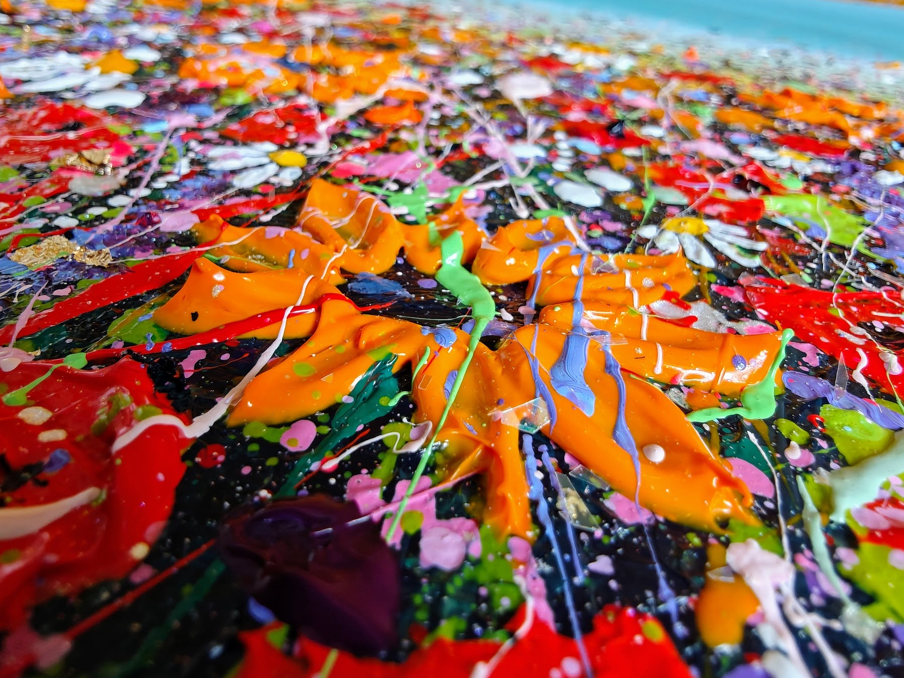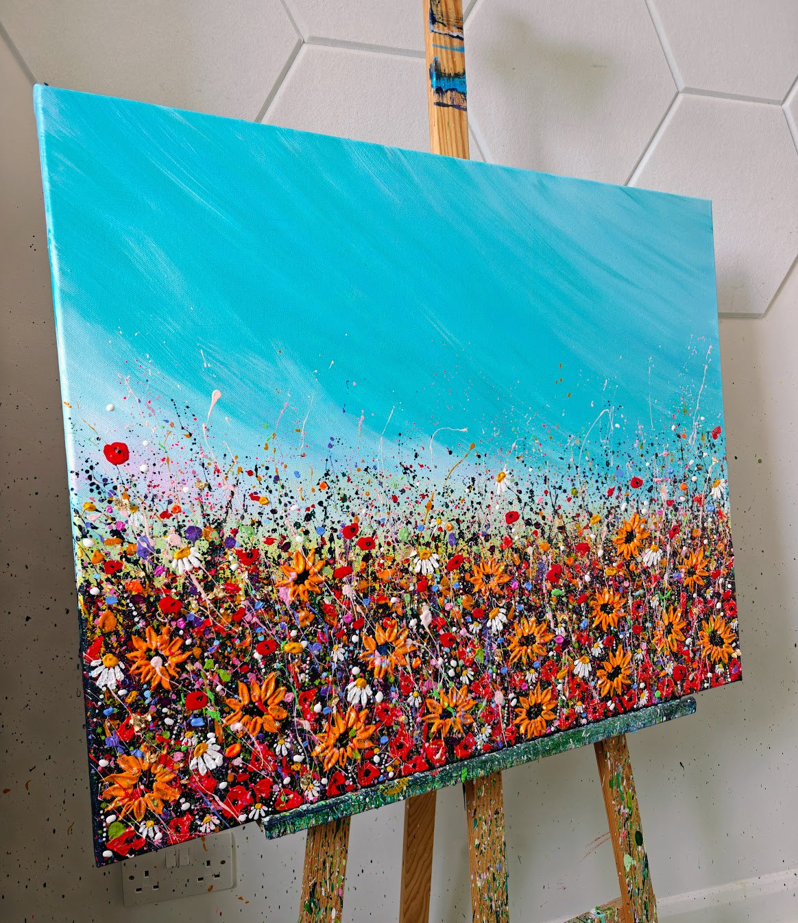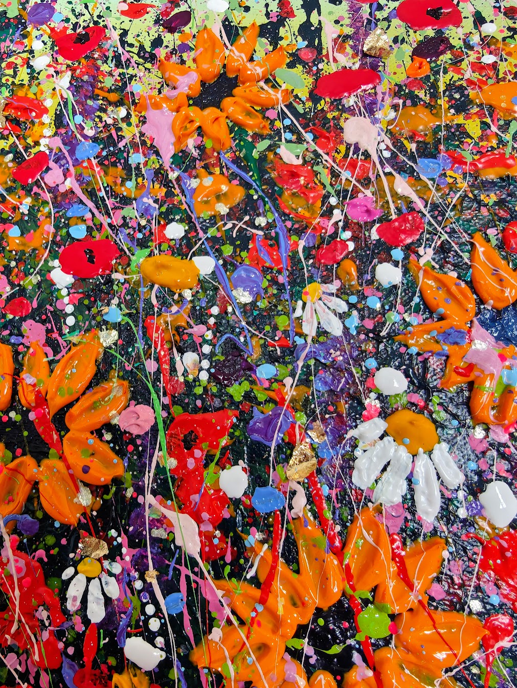 Acrylic, embellishments, glitter, metal leaf and shimmer on canvas.