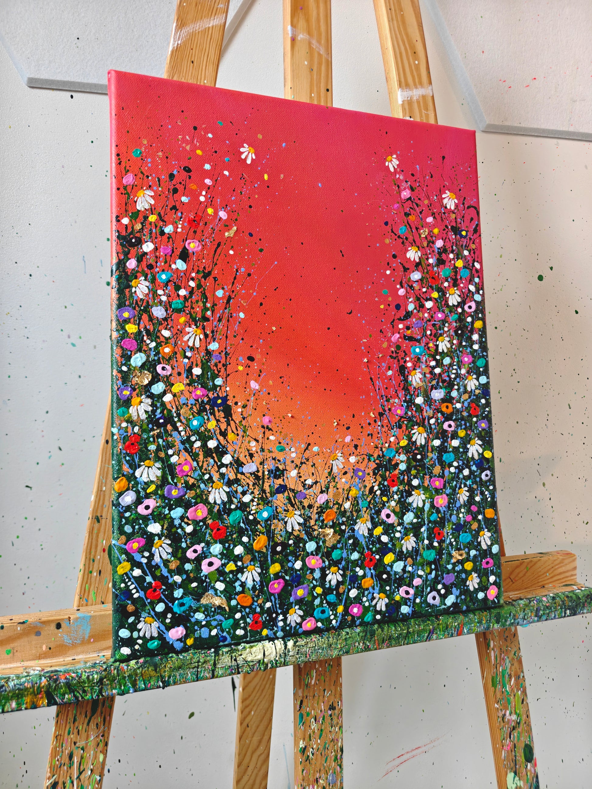 Acrylic, gold leaf, glitter, embellishments and shimmer on stretched canvas.