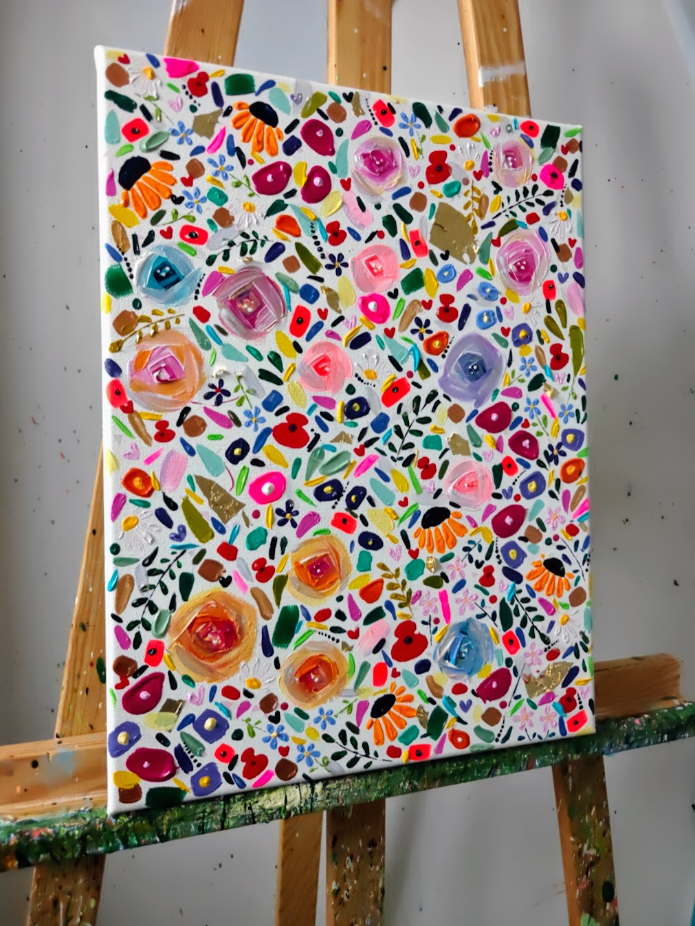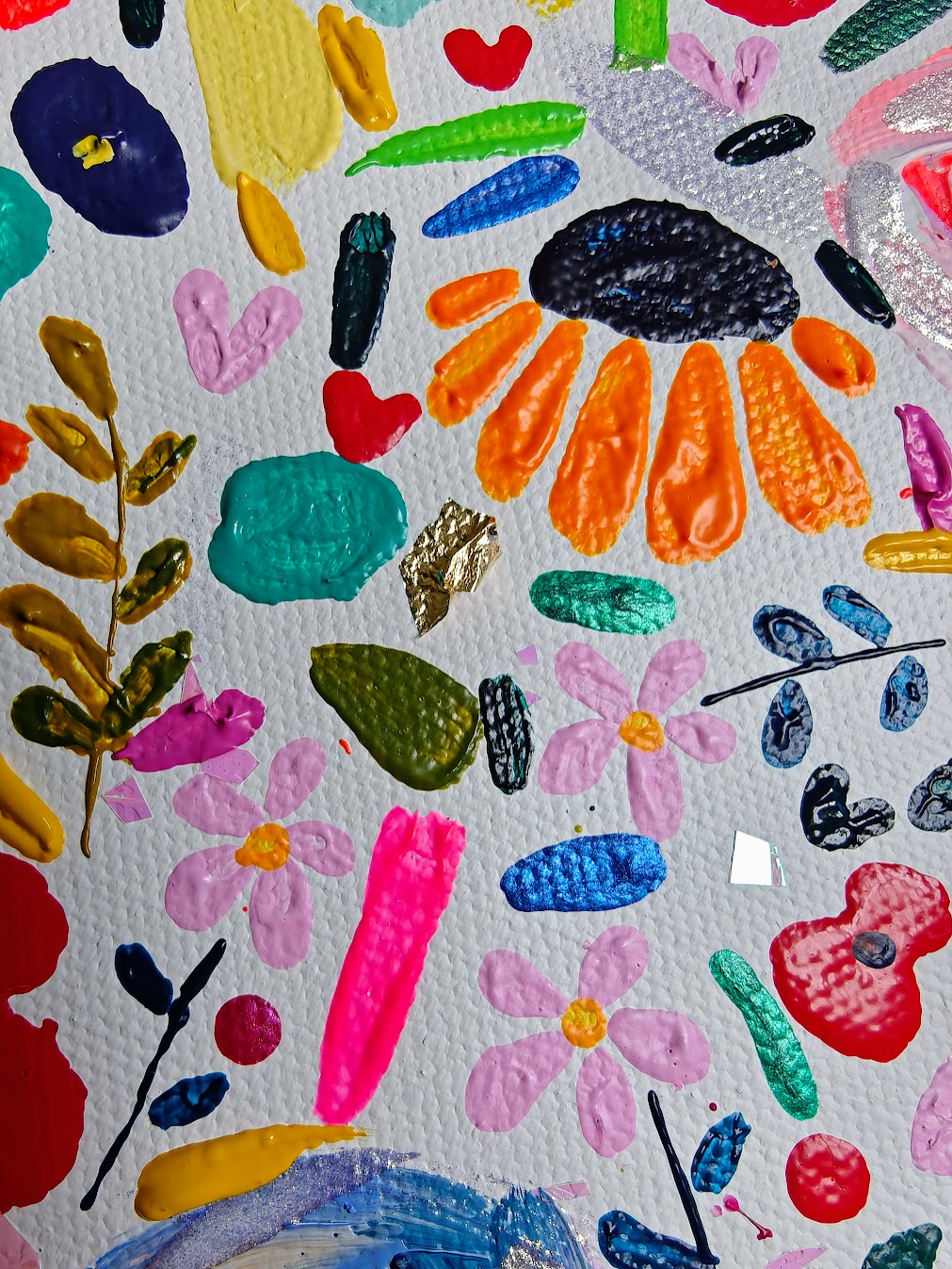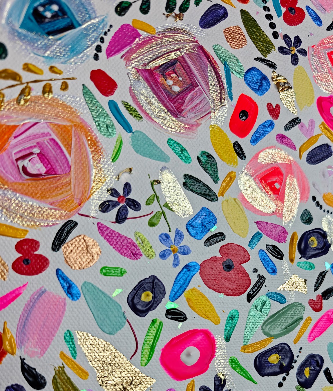 Acrylic, gold leaf, glitter, embellishments and shimmer on stretched canvas.