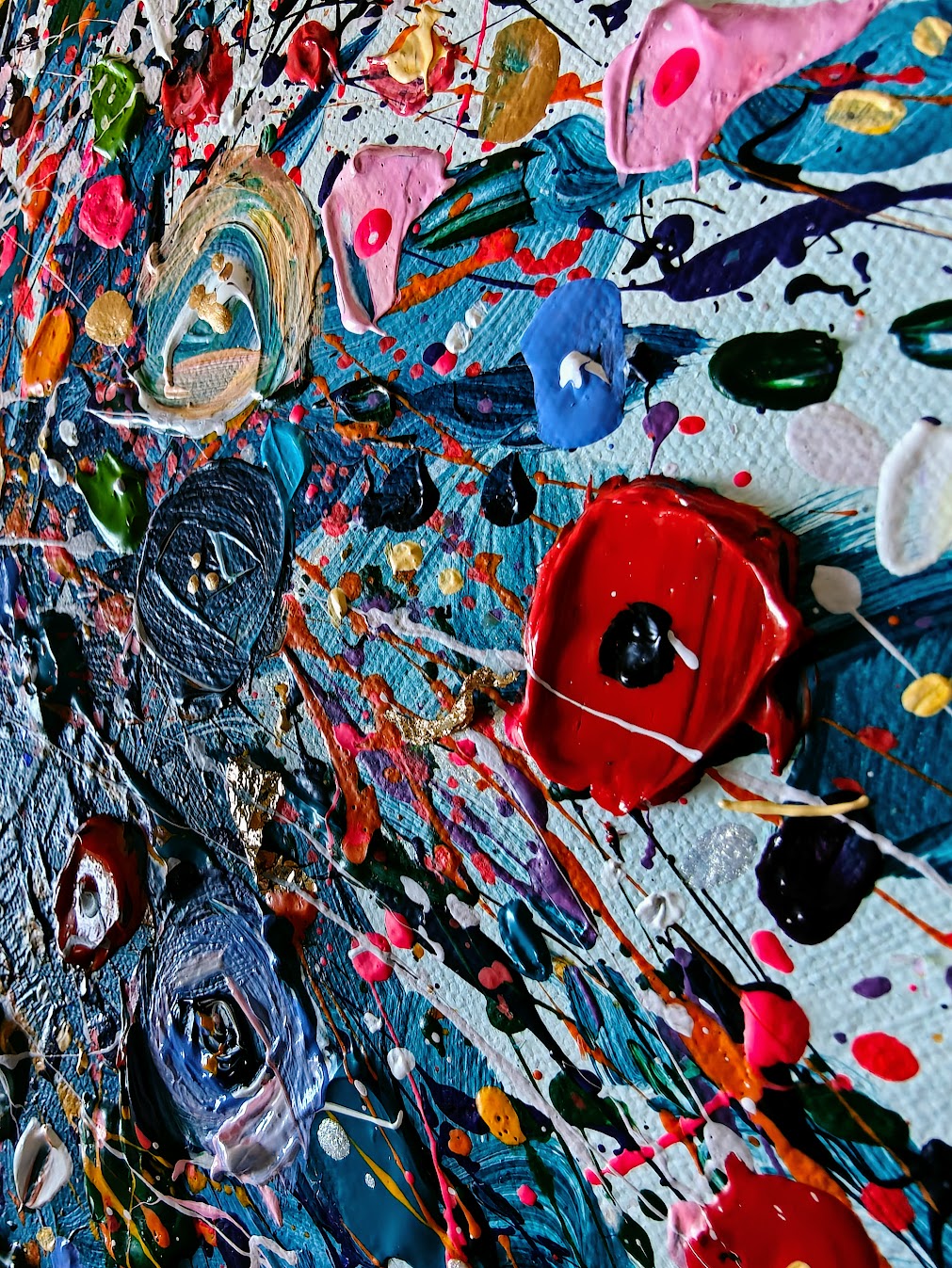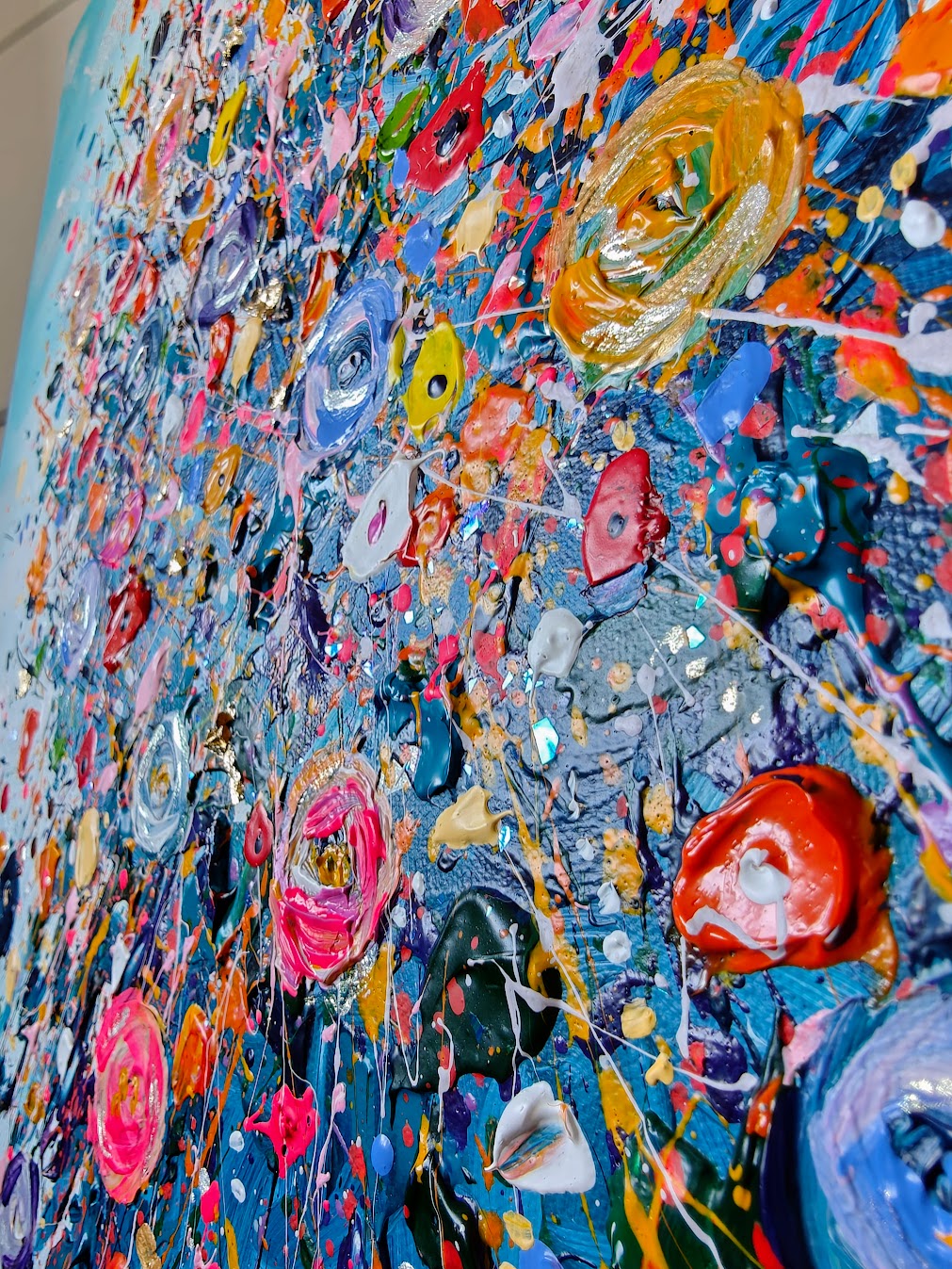 Acrylic, embellishments, glitter, metal leaf and shimmer on canvas.