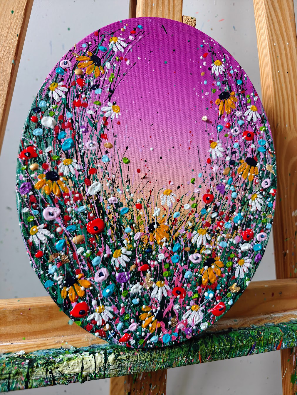 Acrylic, glitter, gold leaf, and embellishments on stretched canvas.