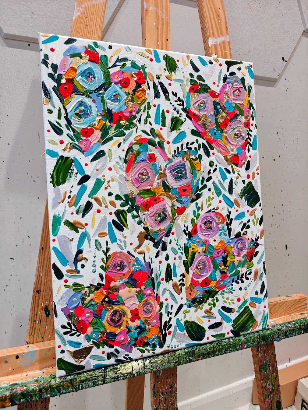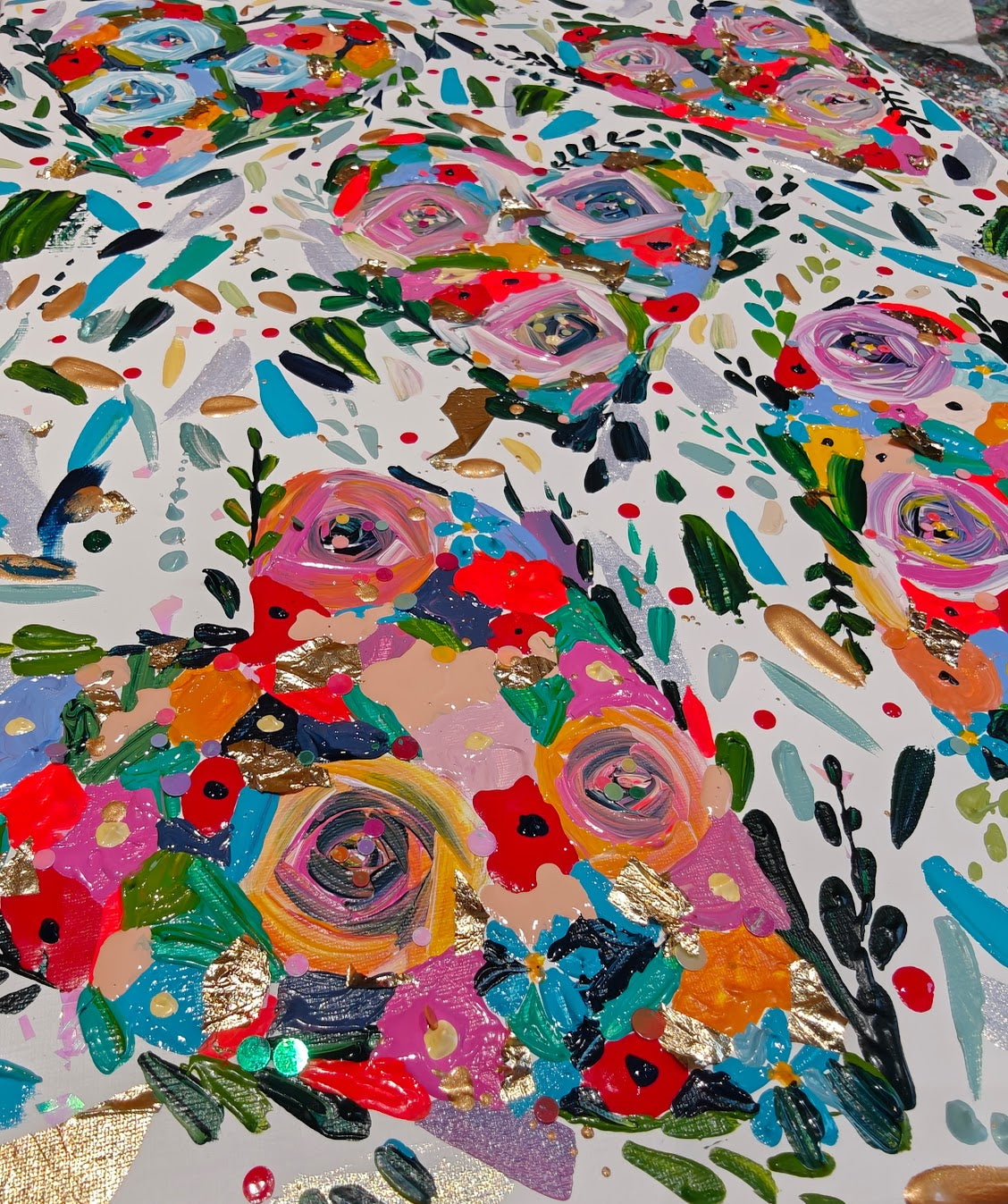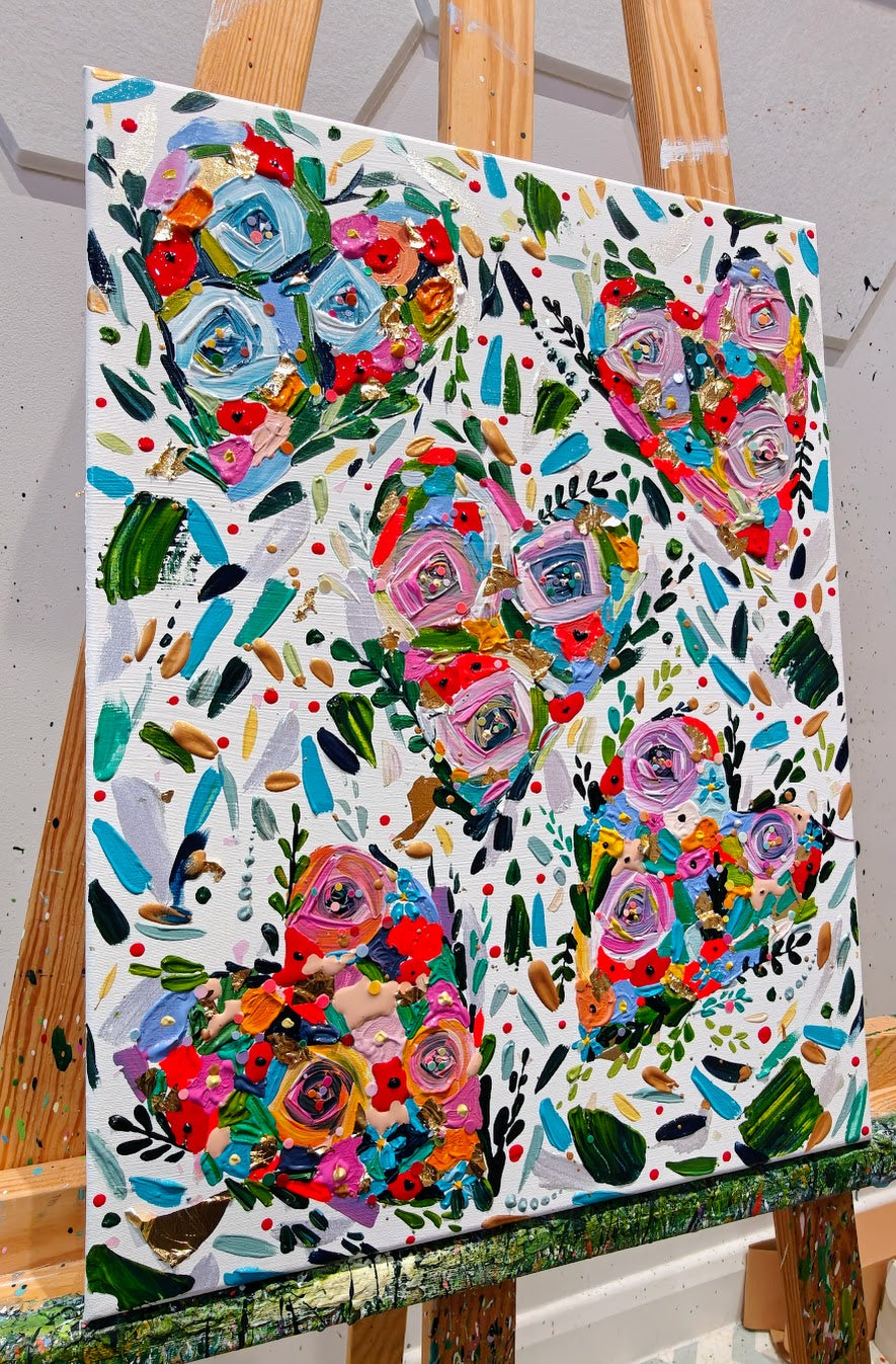 Acrylic, gold leaf, glitter, embellishments and shimmer on stretched canvas.
