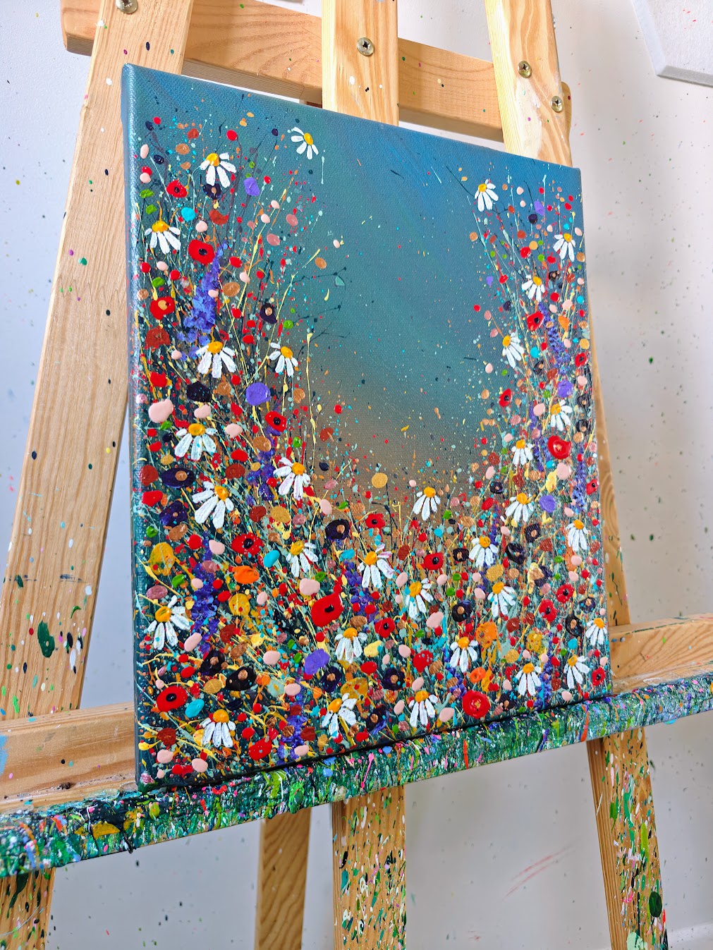 Acrylic, glitter, gold leaf, and embellishments on stretched canvas.