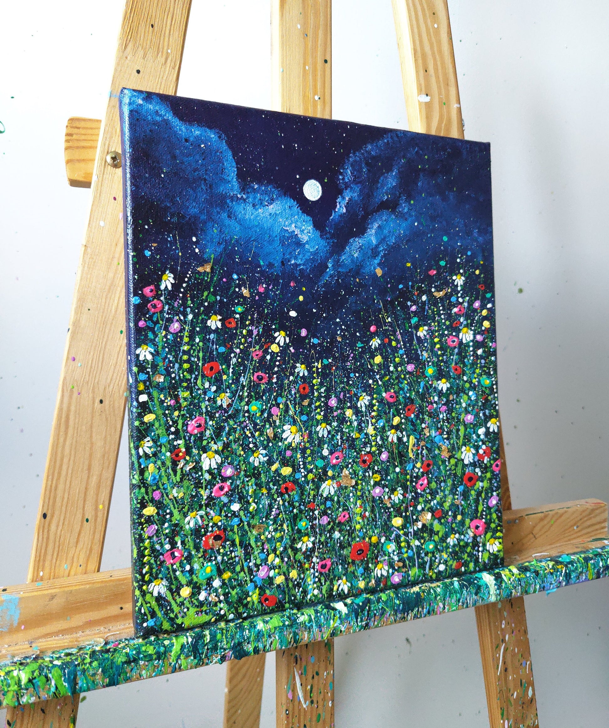 Acrylic, glitter and gold leaf on stretched canvas.