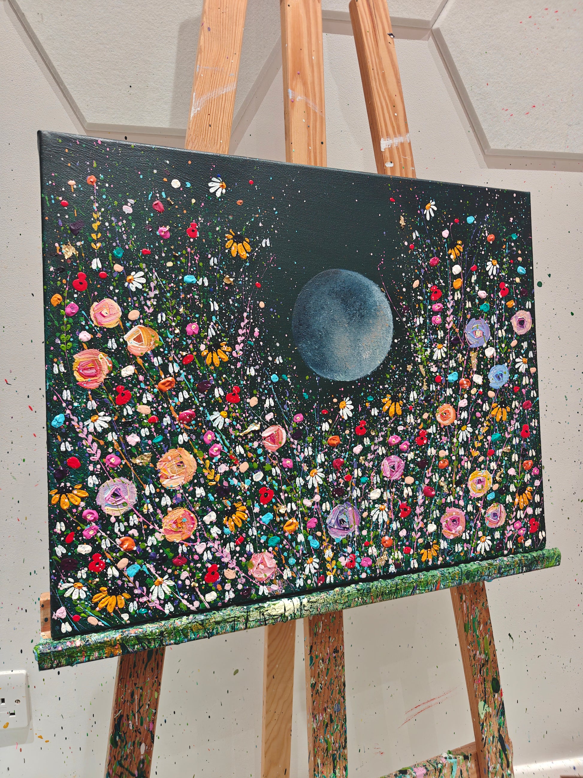 Acrylic, glitter, gold leaf and hand placed embellishments on stretched canvas.