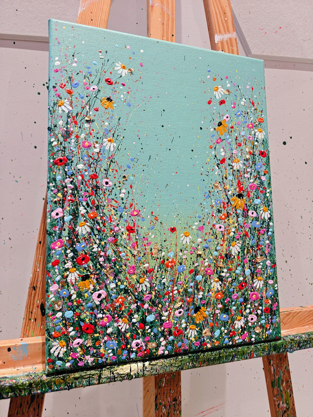 Acrylic, gold leaf, glitter, embellishments and shimmer on stretched canvas.