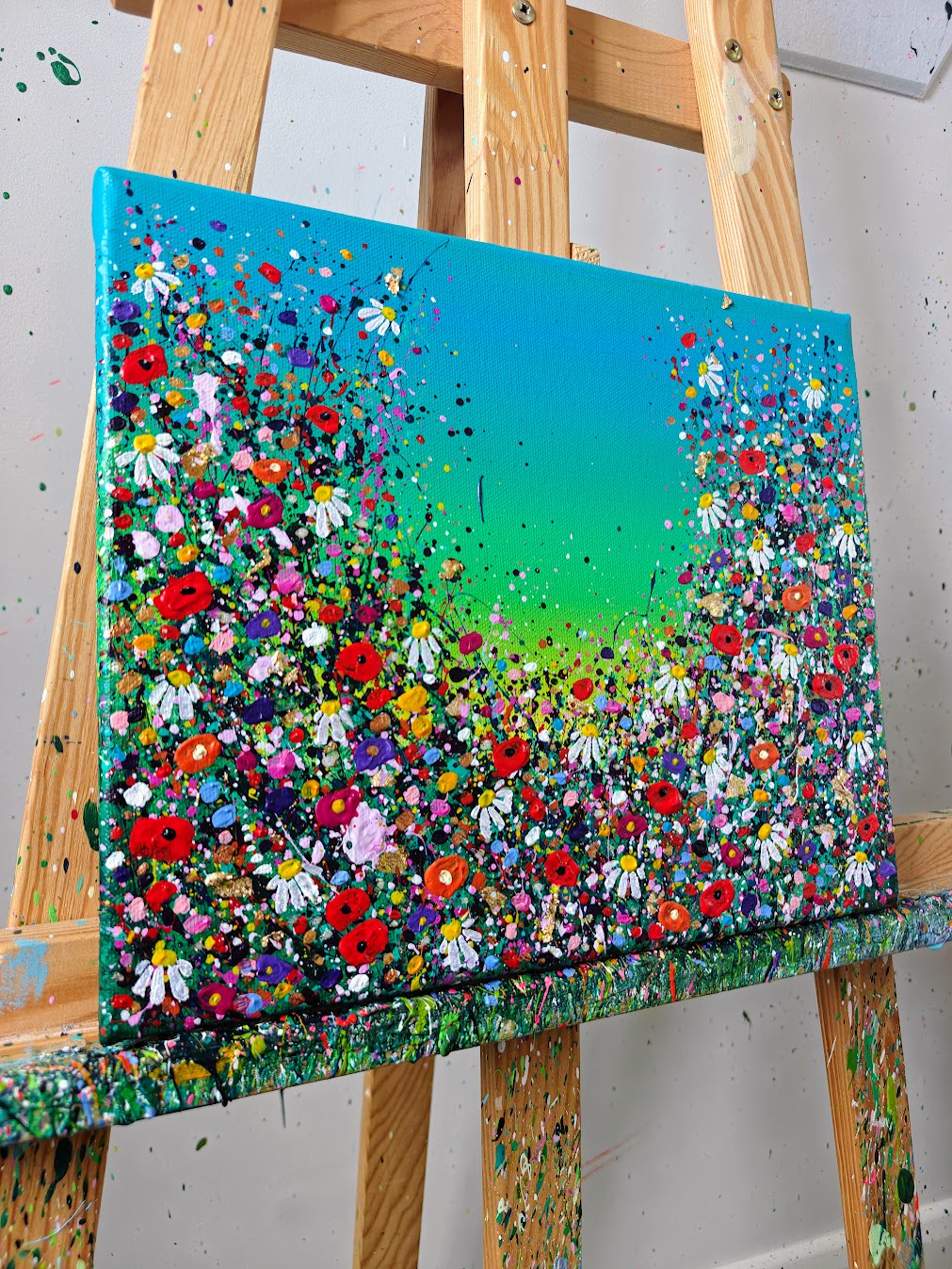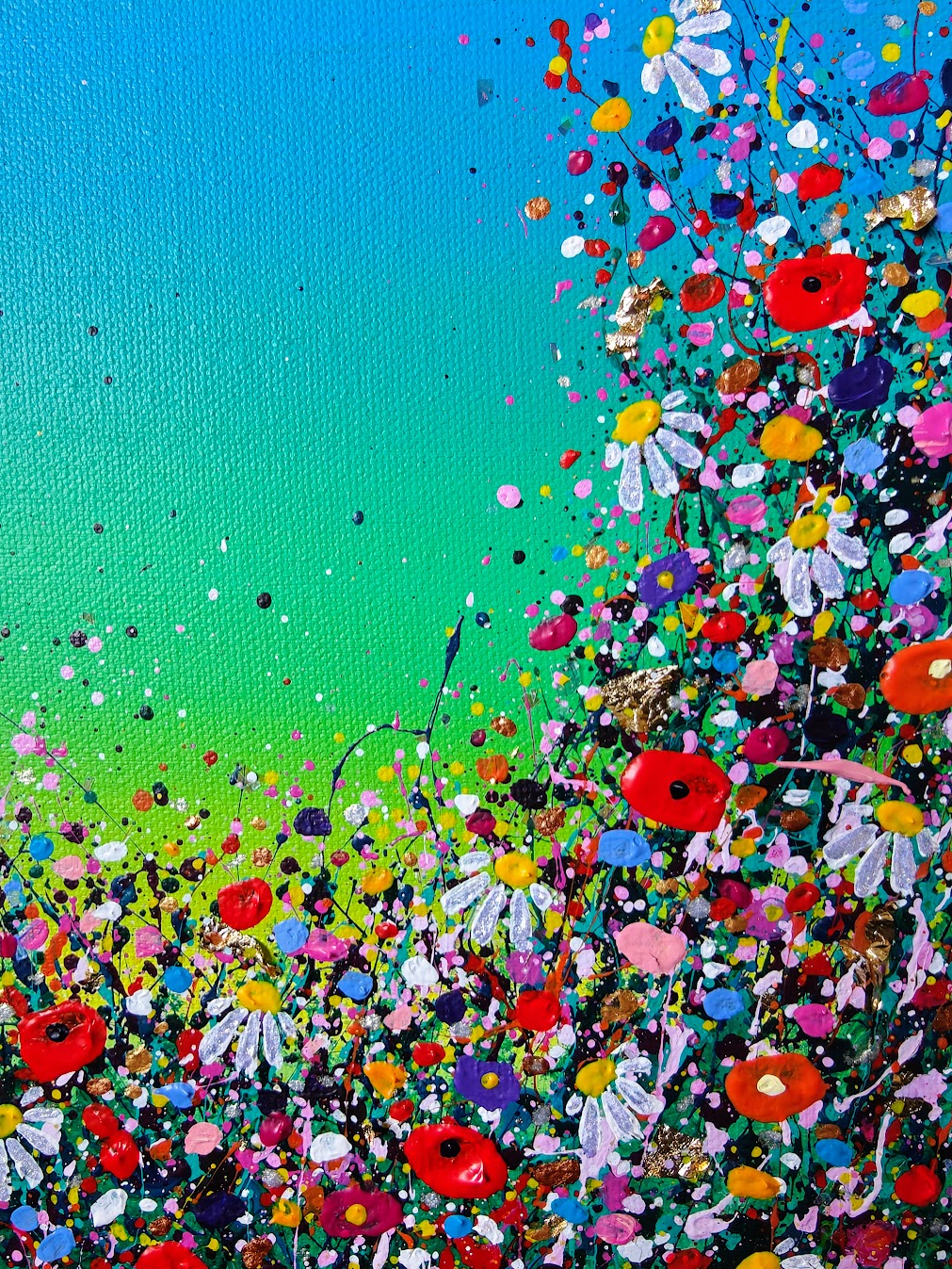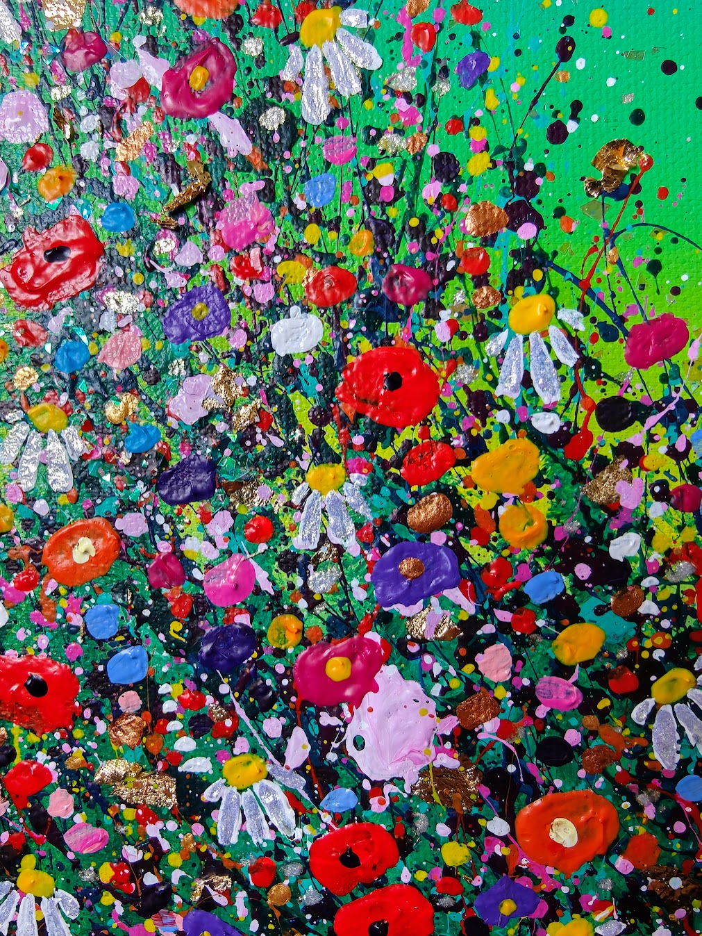 Acrylic, glitter, gold leaf, and embellishments on stretched canvas.
