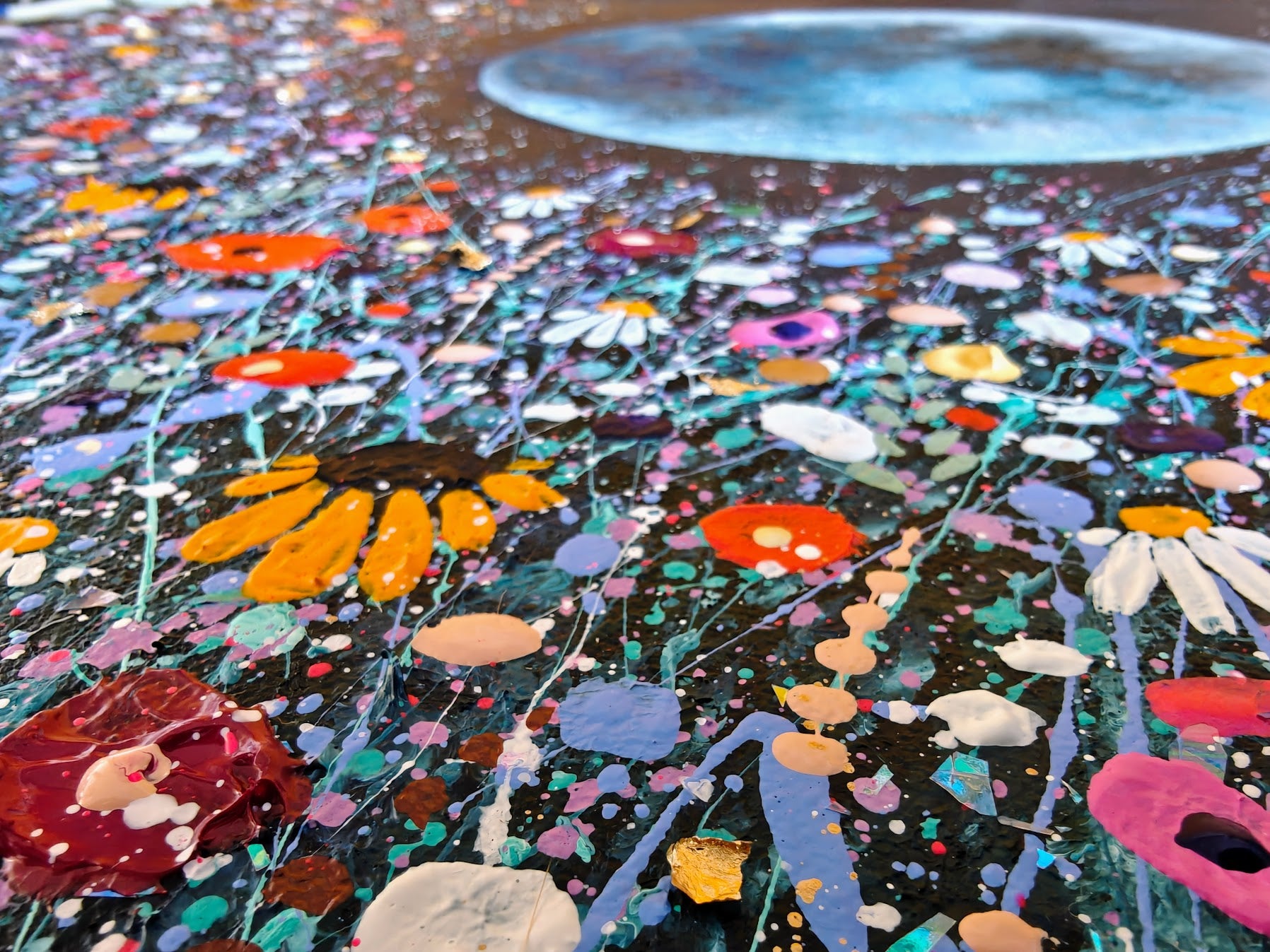 Acrylic, embellishments, glitter, metal leaf and shimmer on canvas.