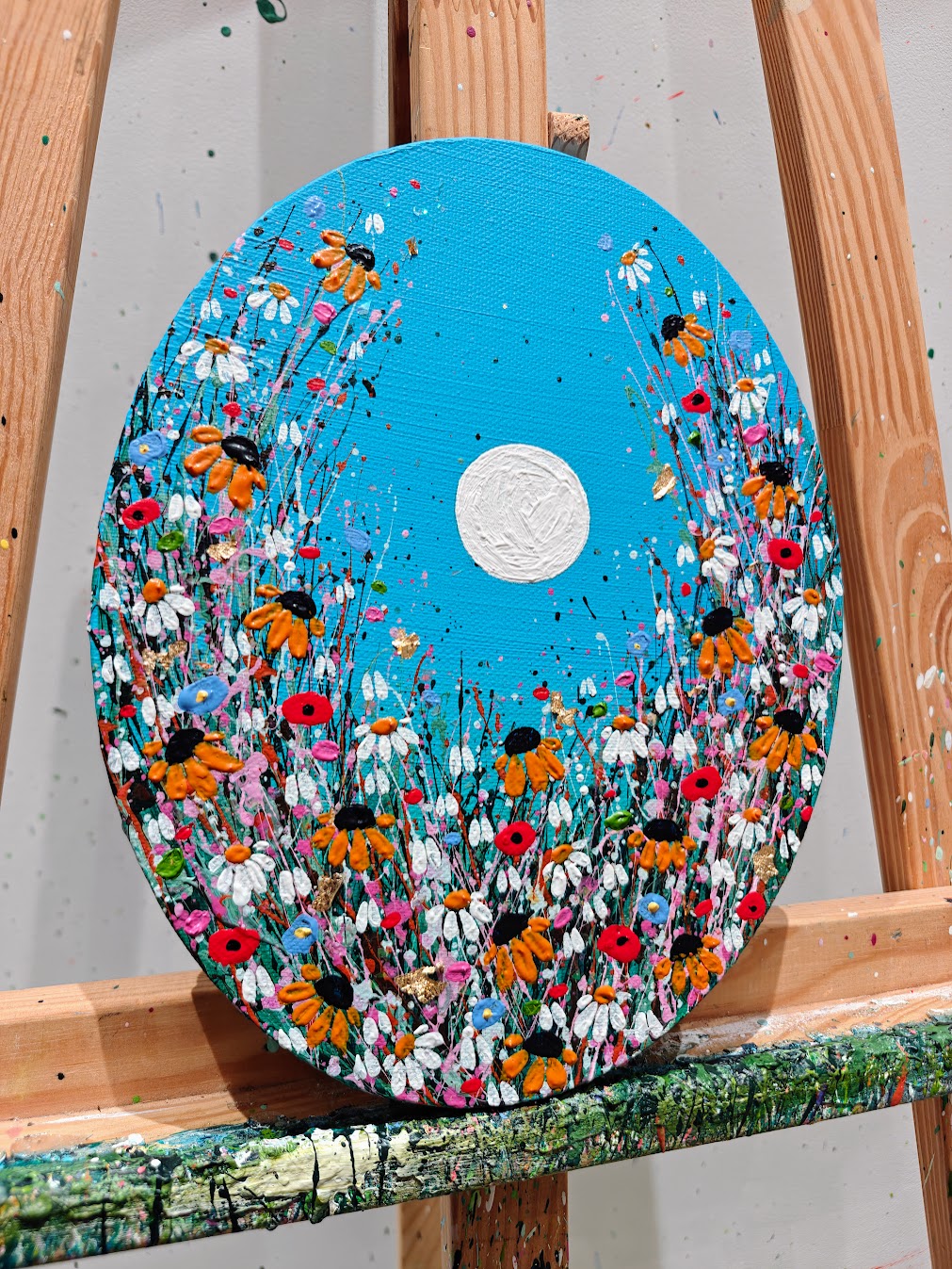 Acrylic, glitter, gold leaf, and embellishments on stretched canvas.