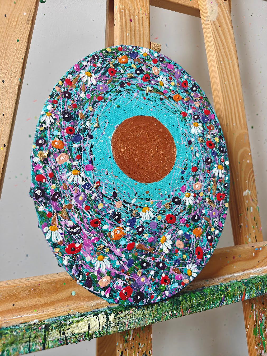 Acrylic, glitter, gold leaf, and embellishments on stretched canvas.