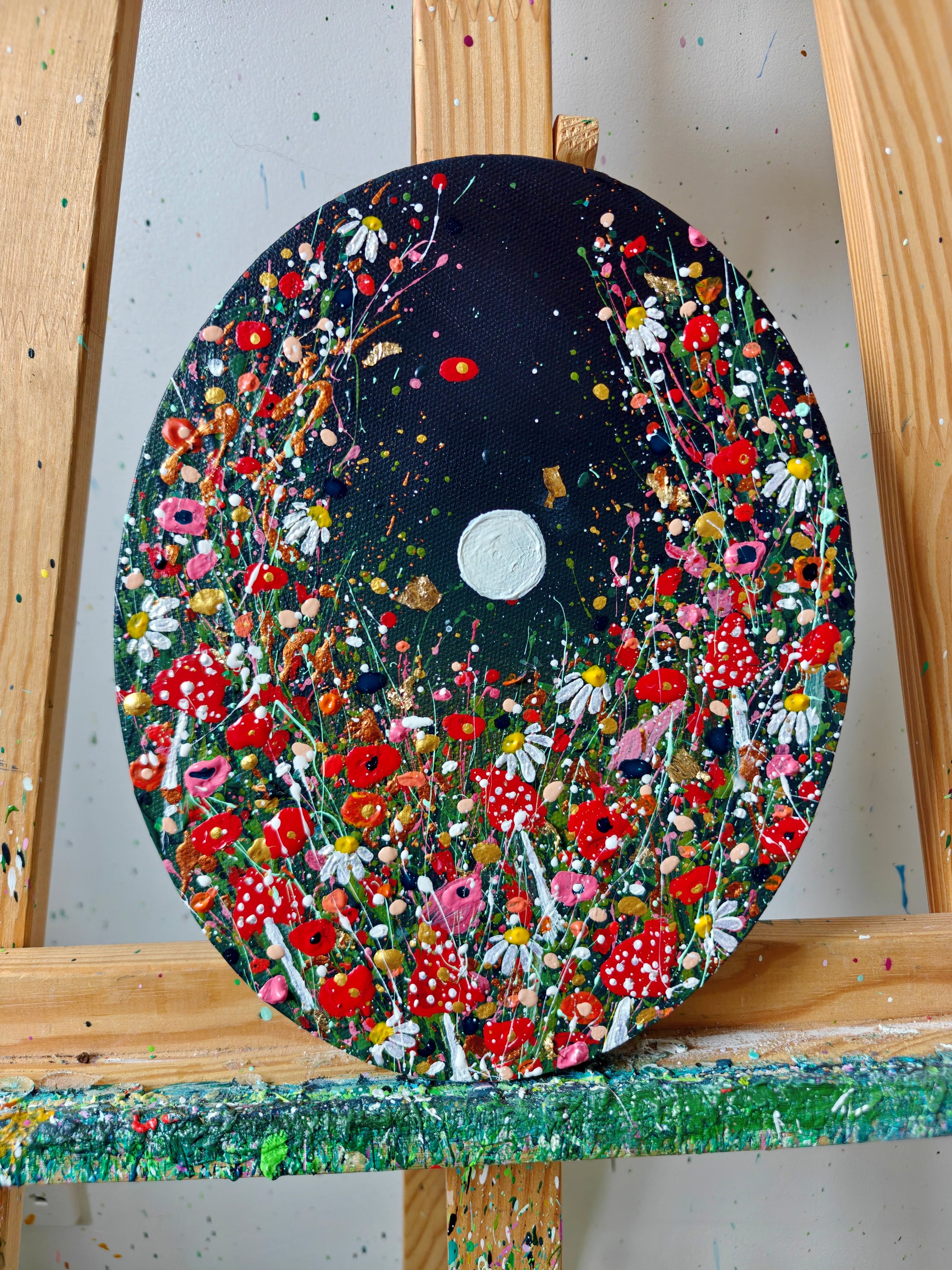 Acrylic, glitter, gold leaf, and embellishments on stretched canvas.